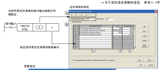 三菱PLC參數(shù)中的內(nèi)置定位設(shè)置的詳細(xì)設(shè)置中有起始軟元件,定位表中每個(gè)脈沖數(shù)和頻率的設(shè)置就從起始軟元件開始每格占2個(gè)(32位數(shù)據(jù))依次排列,修改這些軟元件的數(shù)值就可以。例如起始軟元件是D4000,那么第一個(gè)表的脈沖數(shù)就是D4000+1,頻率是D4002+1,第二個(gè)表的脈沖數(shù)是D4004+1,頻率是D4006+1,這樣依此類推。