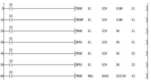 50行:當X0=1時,讀取1號(第1個K1)模塊緩沖區地址29(K29)~32中的數據保存到寄存器D0~D3中。