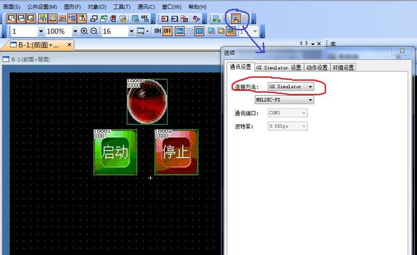 把三菱PLC程序和觸摸屏內(nèi)容編好,先把三菱PLC編程軟件仿真打開(kāi)再打開(kāi)觸摸屏軟件仿真(注意:打開(kāi)觸摸屏軟件仿真之前要先把連接方式設(shè)置成“GX Simulator”,設(shè)置方法如下圖。)